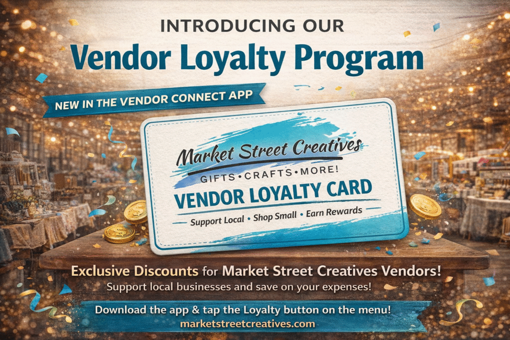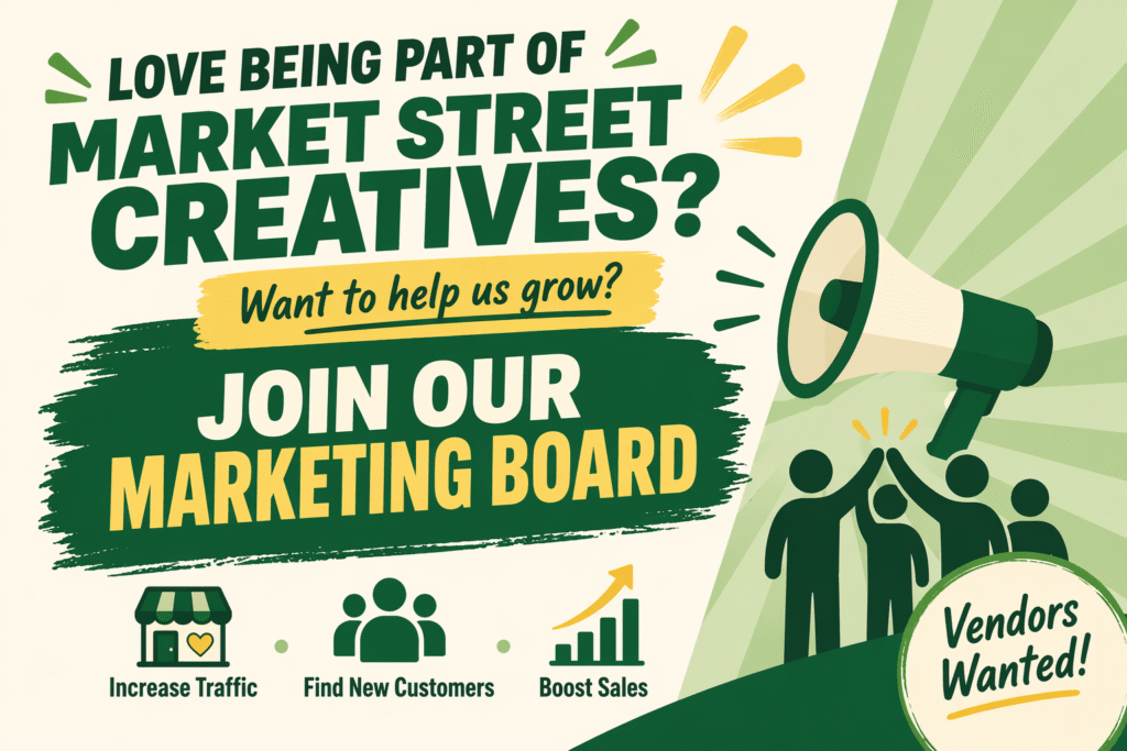 Do you love being part of the Market Street Creatives community? Do you want to help us bring in more traffic, attract new customers, and increase sales for everyone? Then we need you. We are looking to form a Marketing Board made up of 8–10 vendors who want to help shape new ideas, stronger promotions, […]